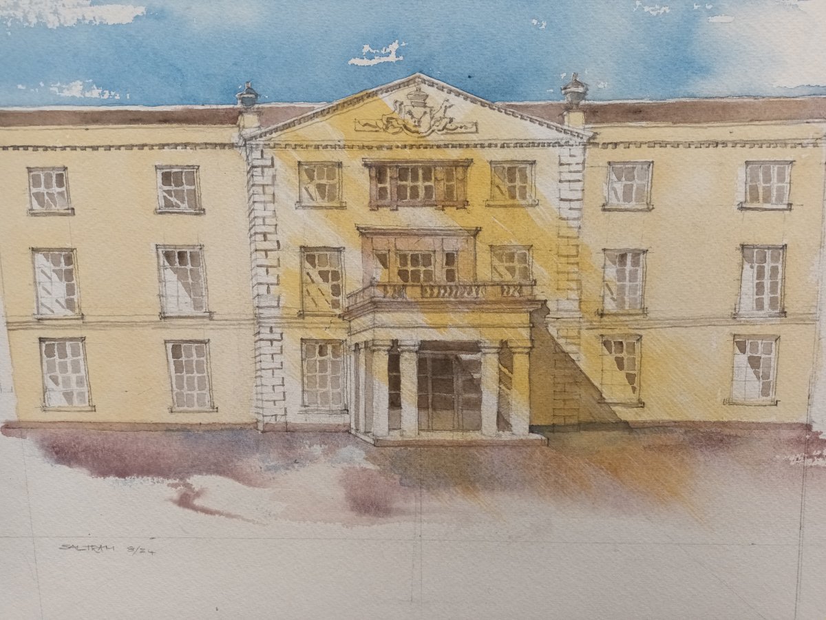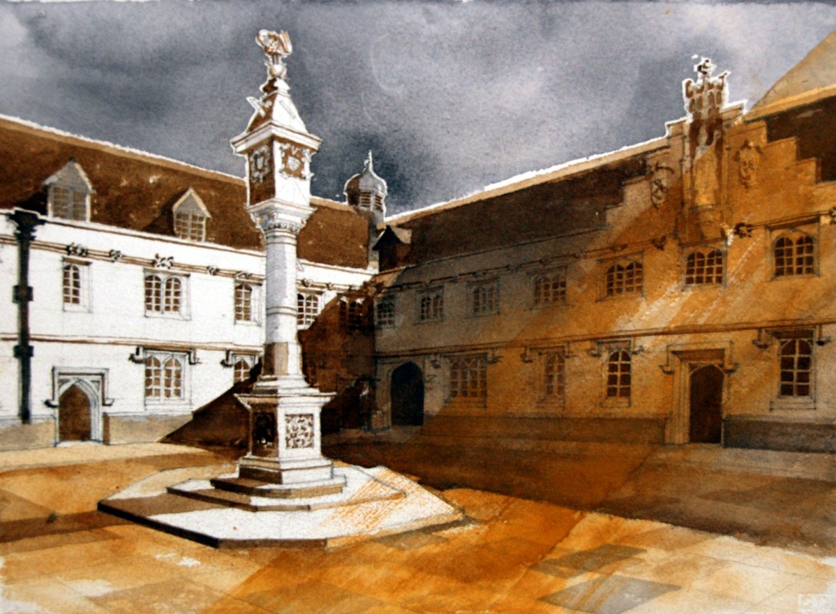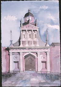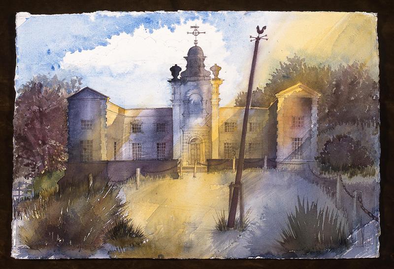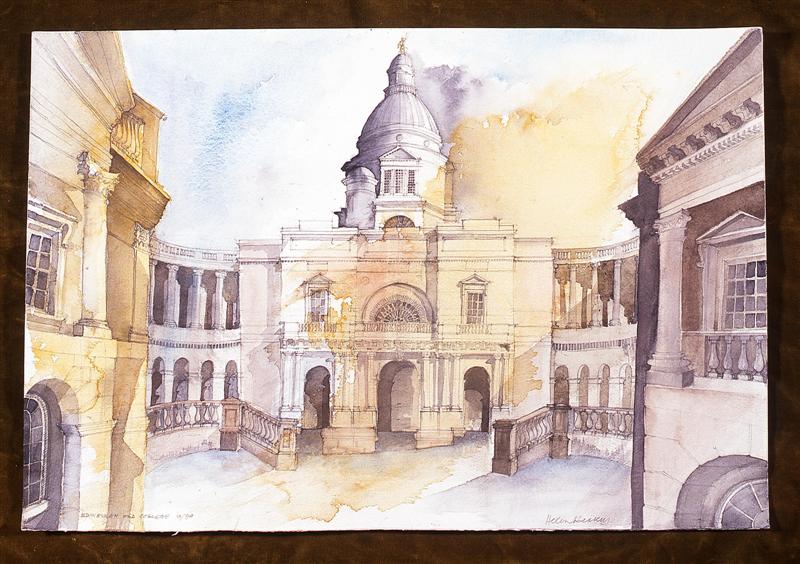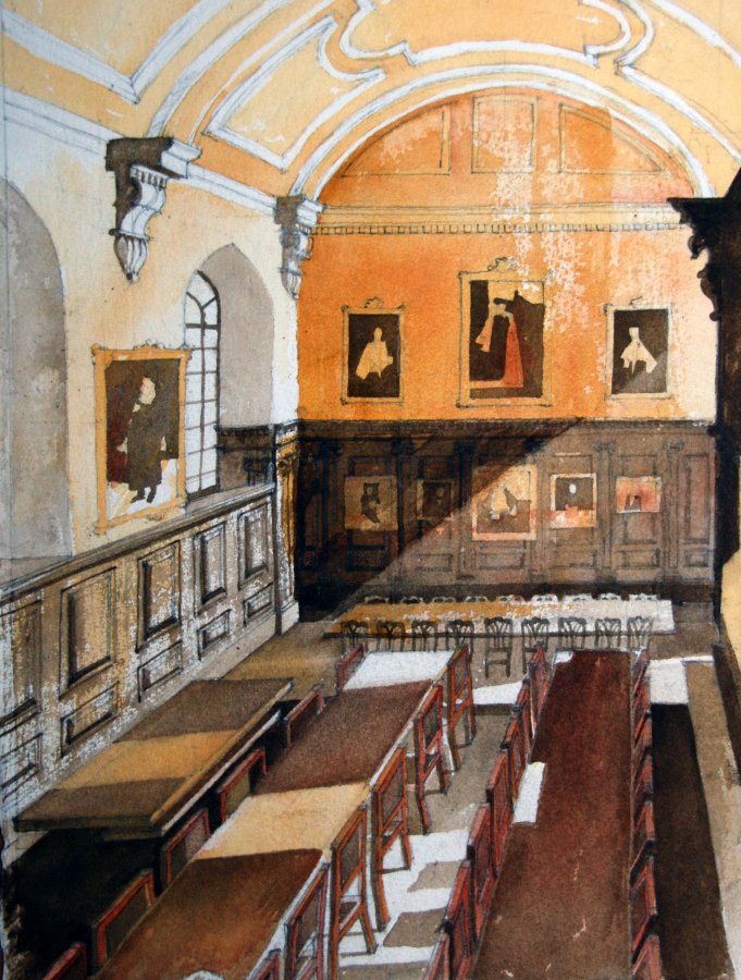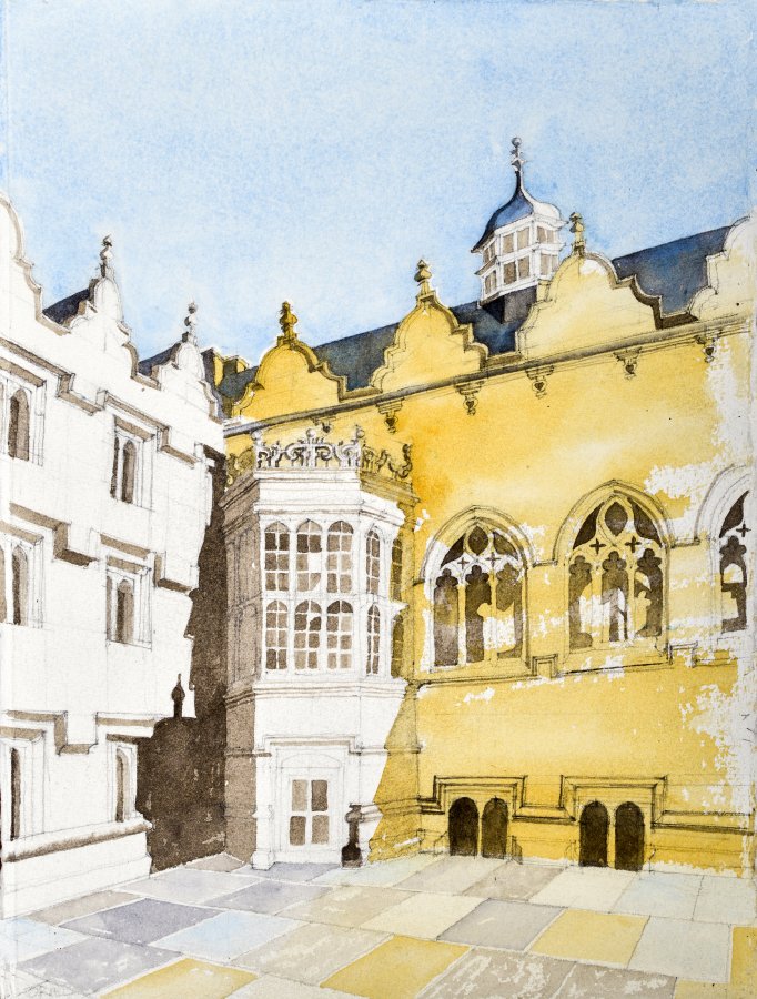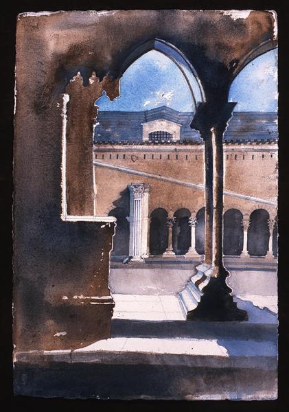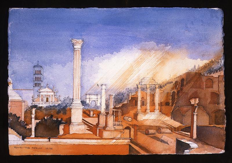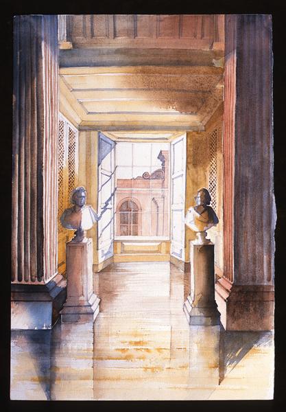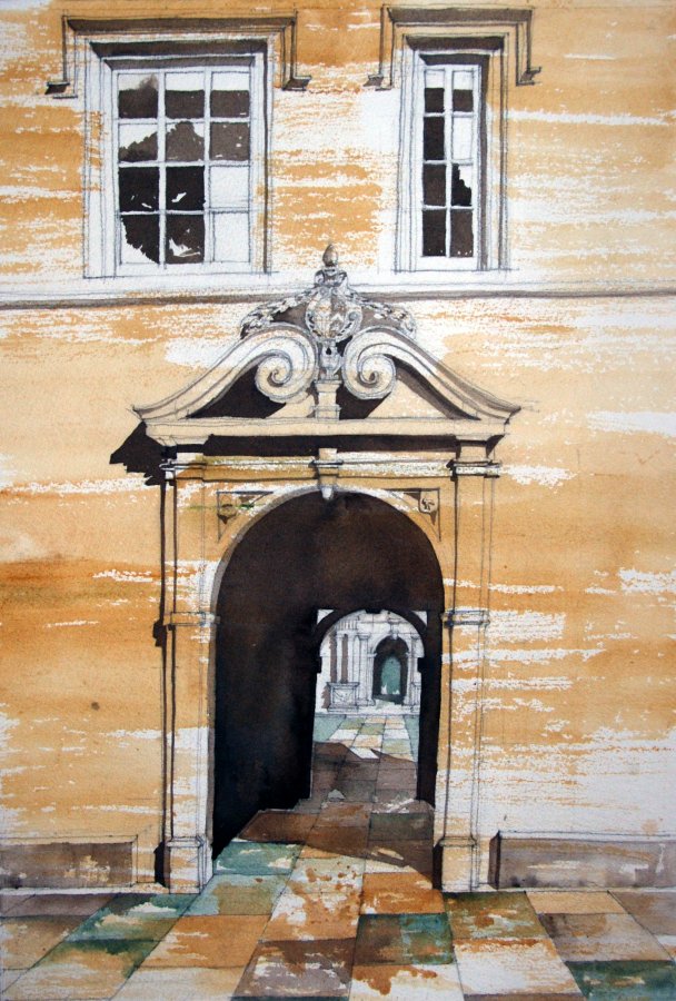 Buildings are endlessly fascinating – the way their surfaces reflect or absorb light, the tiny variations in detailing of a window or a capital are what make the surface of a paining. The structural rules architects have to follow must hold true in a painting, or the viewer feels uneasy without knowing why. The shadows change as the sun shifts and I draw them in all at once at a time when they seem to help the composition. They must be accurate – the eye is a very good computer and you will know if they are wrong.