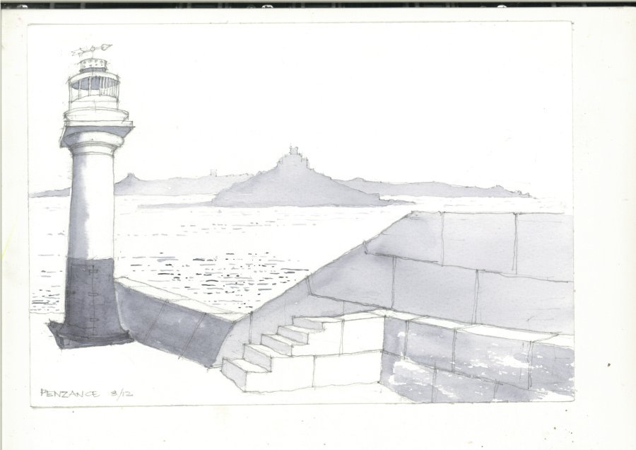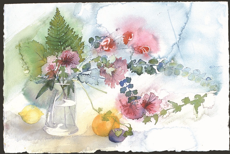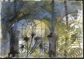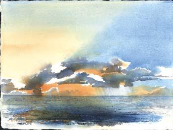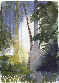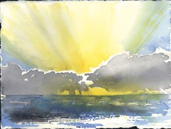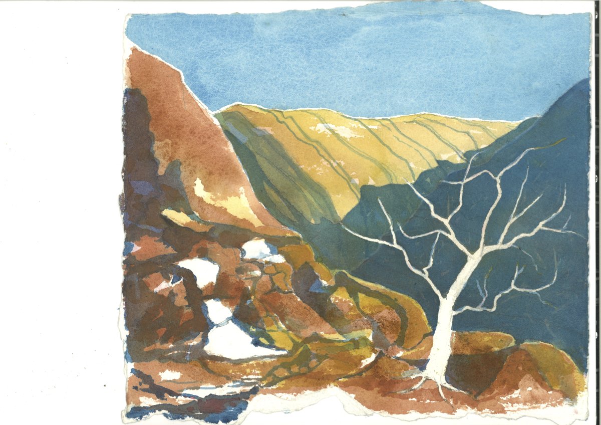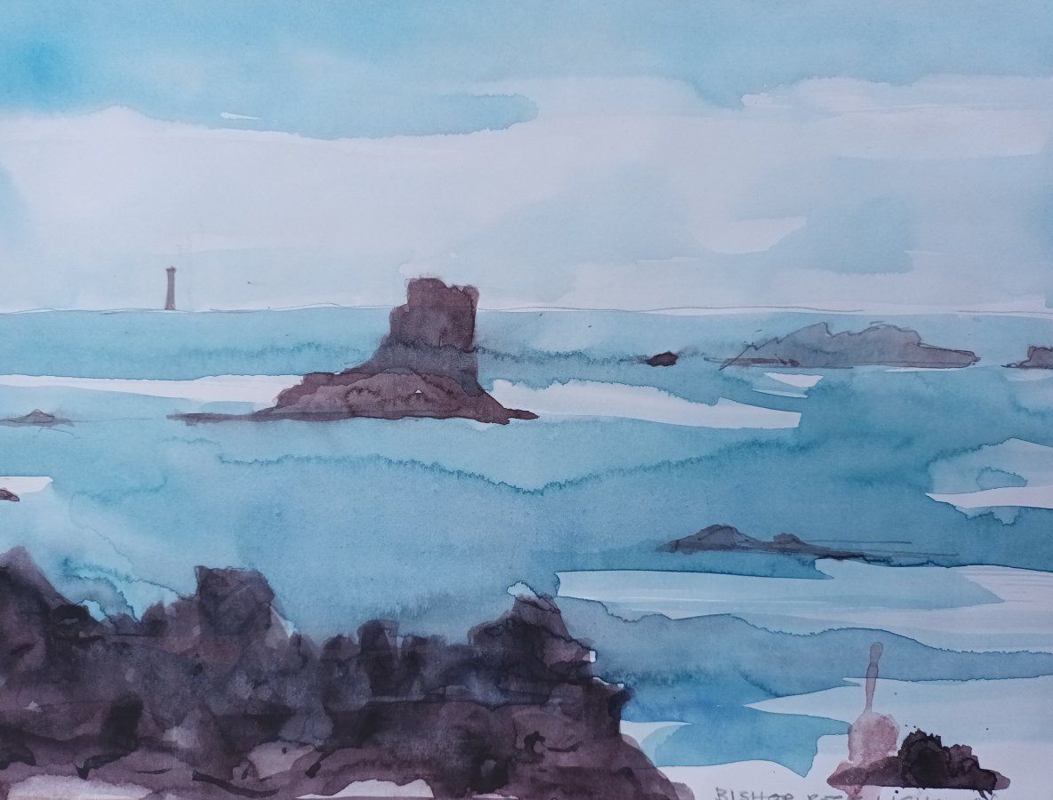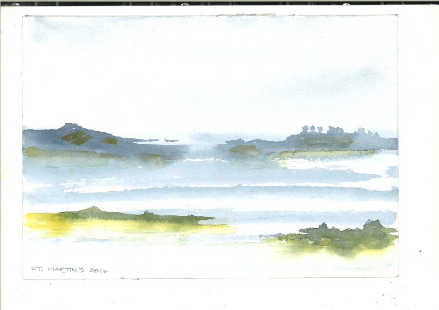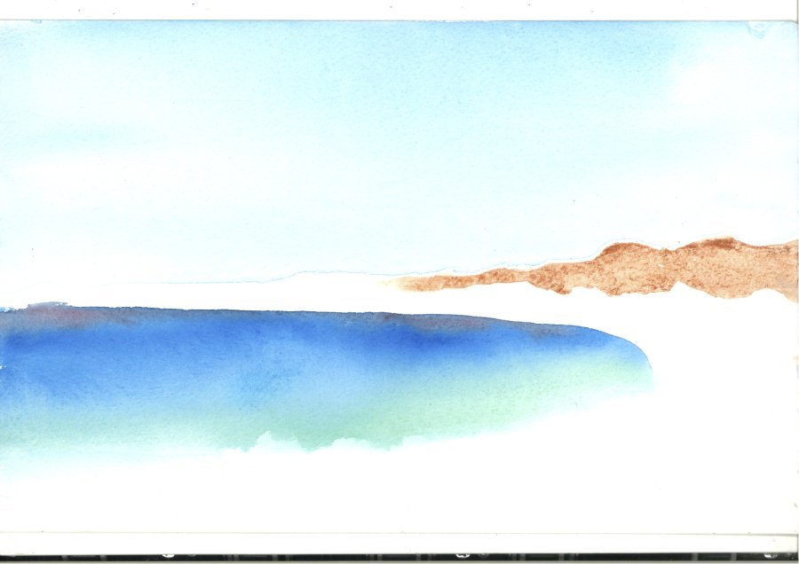 The transient effects of light on sky, sea and foliage are inspiring or tantalizing when I stop looking and try to record them. The translucence of watercolour has a light of its own. White paper is there under the washes to illuminate, and left untouched, to enliven the surface. I need to choose just a few colours. If I put them on in layers, the underneath colour shines through and changes the subsequent colours on top. Sunshine or shadow changes them too.